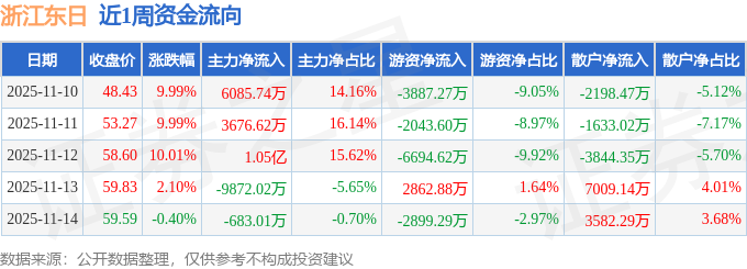 资金流向数据方面,本周浙江东日主力资金合计净流入9746.32万元,游资资金合计净流出1.27亿元,散户资金合计净流入2915.59万元。本周资金流向一览见下表: