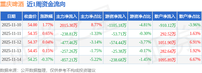沪深股通持股方面,截止2025年11月14日收盘,重庆啤酒沪股通持股数为3015.31万股,占流通股比为623.0%。