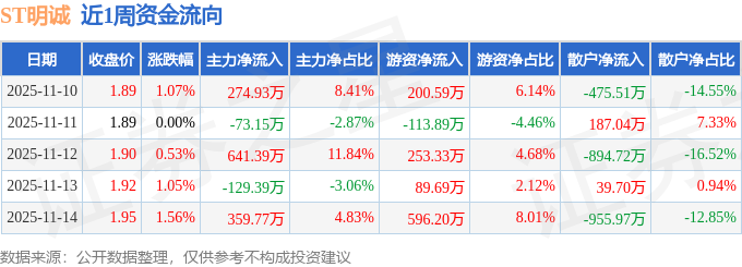 资金流向数据方面,本周ST明诚主力资金合计净流入1073.55万元,游资资金合计净流入1025.91万元,散户资金合计净流出2099.46万元。本周资金流向一览见下表: