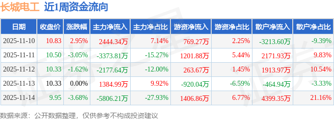 资金流向数据方面,本周长城电工主力资金合计净流出7528.33万元,游资资金合计净流入2721.63万元,散户资金合计净流入4806.7万元。本周资金流向一览见下表: