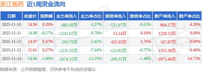 资金流向数据方面,本周浙江医药主力资金合计净流出6424.36万元,游资资金合计净流出105.15万元,散户资金合计净流入6529.51万元。本周资金流向一览见下表: