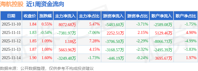 资金流向数据方面,本周海航控股主力资金合计净流入1.49亿元,游资资金合计净流出1.06亿元,散户资金合计净流出4326.08万元。本周资金流向一览见下表:
