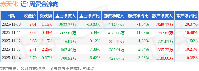 资金流向数据方面,本周赤天化主力资金合计净流出4781.24万元,游资资金合计净流出1663.85万元,散户资金合计净流入6445.09万元。本周资金流向一览见下表: