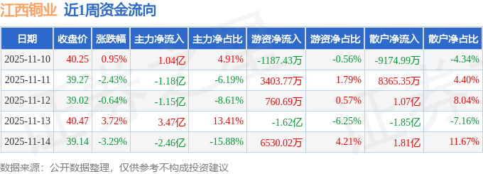 资金流向数据方面,本周江西铜业主力资金合计净流出2778.67万元,游资资金合计净流出6668.89万元,散户资金合计净流入9447.56万元。本周资金流向一览见下表:
