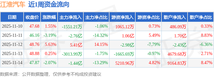 资金流向数据方面,本周江淮汽车主力资金合计净流入7568.84万元,游资资金合计净流出1.46亿元,散户资金合计净流入7013.25万元。本周资金流向一览见下表: