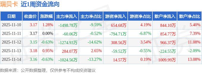 资金流向数据方面,本周瑞贝卡主力资金合计净流出3574.26万元,游资资金合计净流入123.57万元,散户资金合计净流入3450.69万元。本周资金流向一览见下表: