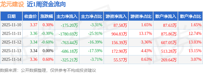 资金流向数据方面,本周龙元建设主力资金合计净流出3730.72万元,游资资金合计净流入1377.27万元,散户资金合计净流入2353.46万元。本周资金流向一览见下表: