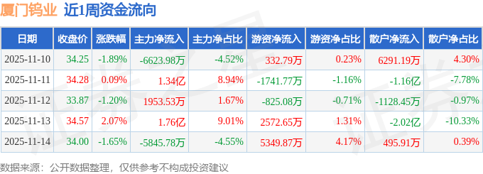 资金流向数据方面,本周厦门钨业主力资金合计净流入2.05亿元,游资资金合计净流入5688.46万元,散户资金合计净流出2.62亿元。本周资金流向一览见下表: