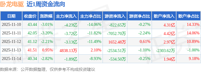 资金流向数据方面,本周卧龙电驱主力资金合计净流出12.48亿元,游资资金合计净流出9291.88万元,散户资金合计净流入13.41亿元。本周资金流向一览见下表: