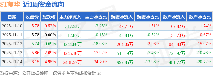 资金流向数据方面,本周ST复华主力资金合计净流入2151.46万元,游资资金合计净流出1212.1万元,散户资金合计净流出939.37万元。本周资金流向一览见下表: