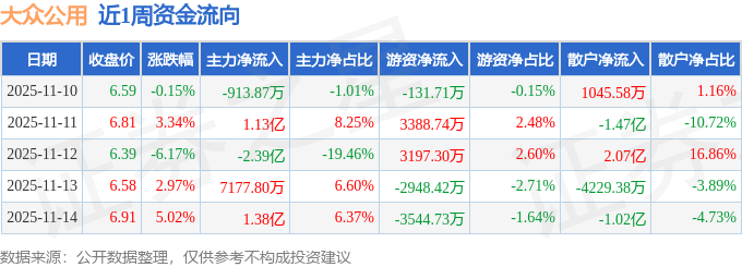 资金流向数据方面,本周大众公用主力资金合计净流入7425.18万元,游资资金合计净流出38.82万元,散户资金合计净流出7386.36万元。本周资金流向一览见下表: