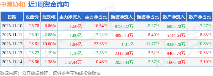资金流向数据方面,本周中源协和主力资金合计净流入1.36亿元,游资资金合计净流出1.37亿元,散户资金合计净流入101.33万元。本周资金流向一览见下表: