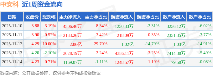 资金流向数据方面,本周中安科主力资金合计净流入2.91亿元,游资资金合计净流出5637.47万元,散户资金合计净流出2.34亿元。本周资金流向一览见下表: