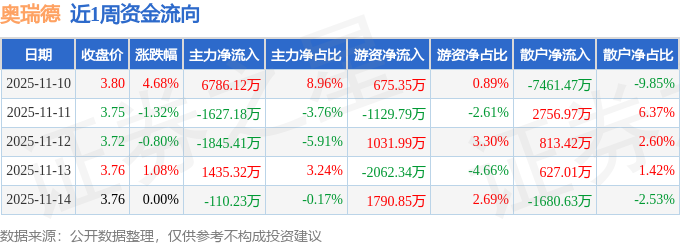 资金流向数据方面,本周奥瑞德主力资金合计净流入4638.62万元,游资资金合计净流入306.07万元,散户资金合计净流出4944.69万元。本周资金流向一览见下表: