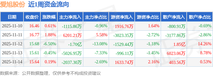 资金流向数据方面,本周爱旭股份主力资金合计净流出1.89亿元,游资资金合计净流出1998.4万元,散户资金合计净流入2.09亿元。本周资金流向一览见下表: