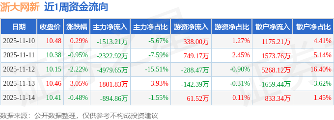 资金流向数据方面,本周浙大网新主力资金合计净流出7908.81万元,游资资金合计净流入717.83万元,散户资金合计净流入7190.98万元。本周资金流向一览见下表: