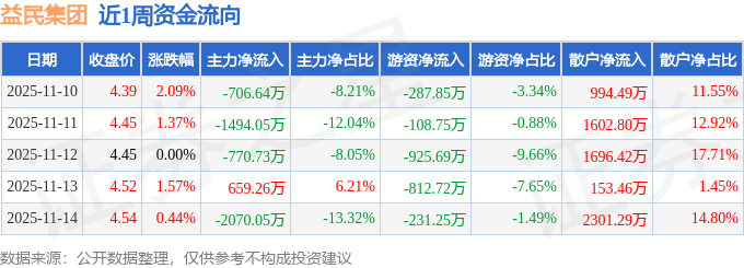 资金流向数据方面,本周益民集团主力资金合计净流出4382.21万元,游资资金合计净流出2366.26万元,散户资金合计净流入6748.46万元。本周资金流向一览见下表: