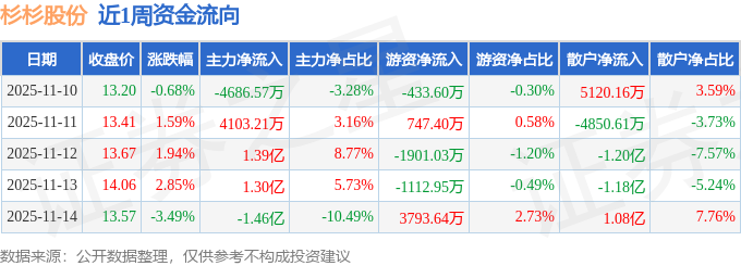 资金流向数据方面,本周杉杉股份主力资金合计净流入1.17亿元,游资资金合计净流入1093.47万元,散户资金合计净流出1.28亿元。本周资金流向一览见下表: