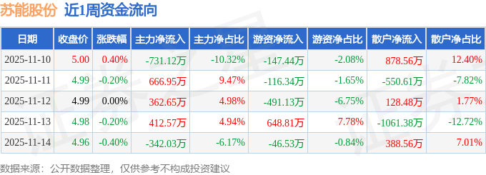 资金流向数据方面,本周苏能股份主力资金合计净流入369.02万元,游资资金合计净流出152.63万元,散户资金合计净流出216.39万元。本周资金流向一览见下表: