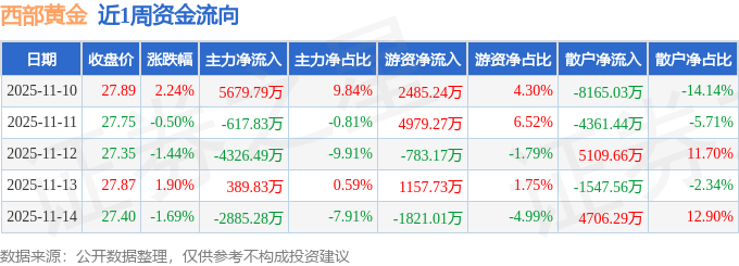 资金流向数据方面,本周西部黄金主力资金合计净流出1759.98万元,游资资金合计净流入6018.07万元,散户资金合计净流出4258.09万元。本周资金流向一览见下表: