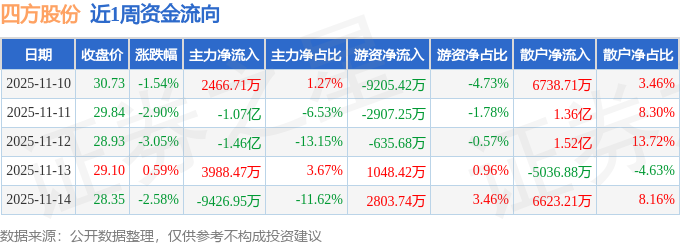 资金流向数据方面,本周四方股份主力资金合计净流出2.83亿元,游资资金合计净流出8896.2万元,散户资金合计净流入3.72亿元。本周资金流向一览见下表: