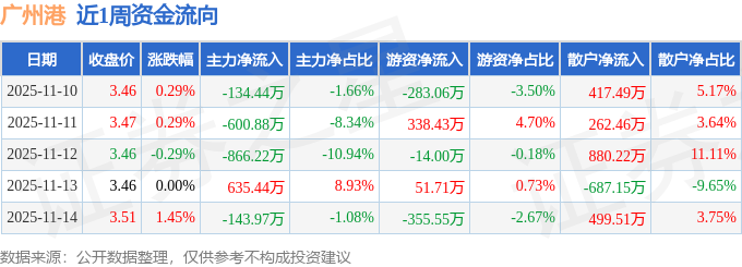 资金流向数据方面,本周广州港主力资金合计净流出1110.07万元,游资资金合计净流出262.46万元,散户资金合计净流入1372.53万元。本周资金流向一览见下表:
