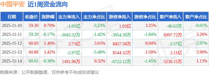 资金流向数据方面,本周中国平安主力资金合计净流出1.41亿元,游资资金合计净流入1.65亿元,散户资金合计净流出2388.78万元。本周资金流向一览见下表: