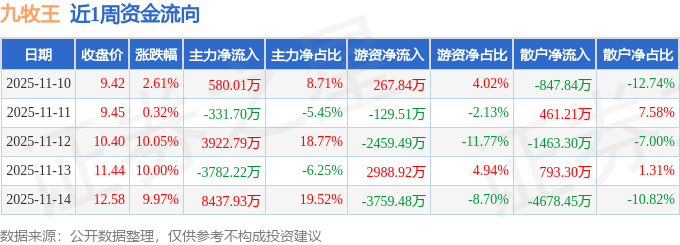 资金流向数据方面,本周九牧王主力资金合计净流入8826.81万元,游资资金合计净流出3091.72万元,散户资金合计净流出5735.08万元。本周资金流向一览见下表: