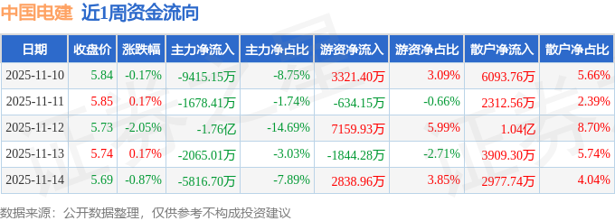 资金流向数据方面,本周中国电建主力资金合计净流出3.65亿元,游资资金合计净流入1.08亿元,散户资金合计净流入2.57亿元。本周资金流向一览见下表: