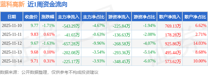 资金流向数据方面,本周蓝科高新主力资金合计净流出1669.47万元,游资资金合计净流出1272.86万元,散户资金合计净流入2942.33万元。本周资金流向一览见下表: