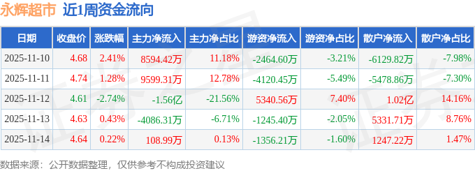资金流向数据方面,本周永辉超市主力资金合计净流出1338.98万元,游资资金合计净流出3846.1万元,散户资金合计净流入5185.08万元。本周资金流向一览见下表: