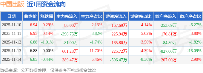 资金流向数据方面,本周中国出版主力资金合计净流入599.0万元,游资资金合计净流入188.68万元,散户资金合计净流出787.68万元。本周资金流向一览见下表: