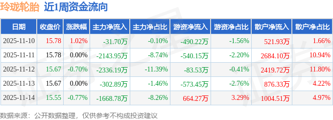 资金流向数据方面,本周玲珑轮胎主力资金合计净流出6483.51万元,游资资金合计净流出1023.09万元,散户资金合计净流入7506.59万元。本周资金流向一览见下表:
