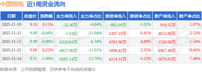 资金流向数据方面,本周中国核电主力资金合计净流出3.45亿元,游资资金合计净流入1.54亿元,散户资金合计净流入1.91亿元。本周资金流向一览见下表: