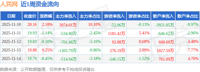 资金流向数据方面,本周人民网主力资金合计净流入919.01万元,游资资金合计净流入1251.38万元,散户资金合计净流出2170.4万元。本周资金流向一览见下表: