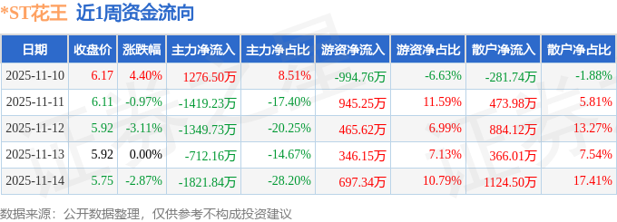 证券之星消息,截至2025年11月14日收盘,*ST花王(603007)报收于5.75元,较上周的5.91元下跌2.71%。本周,*ST花王11月10日盘中最高价报6.21元。11月14日盘中最低价报5.74元。*ST花王当前最新总市值50.42亿元,在基础建设板块市值排名24/45,在两市A股市值排名3358/5165。