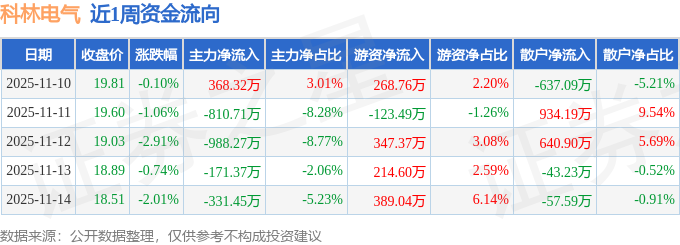 资金流向数据方面,本周科林电气主力资金合计净流出1933.48万元,游资资金合计净流入1096.29万元,散户资金合计净流入837.18万元。本周资金流向一览见下表: