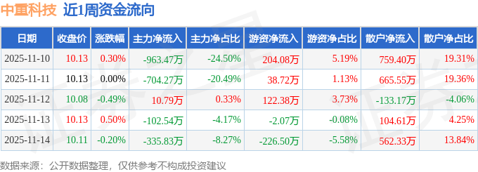 资金流向数据方面,本周中重科技主力资金合计净流出2095.33万元,游资资金合计净流入136.62万元,散户资金合计净流入1958.71万元。本周资金流向一览见下表:
