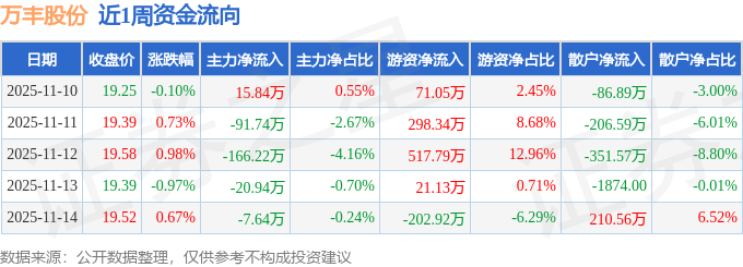 资金流向数据方面,本周万丰股份主力资金合计净流出270.71万元,游资资金合计净流入705.38万元,散户资金合计净流出434.67万元。本周资金流向一览见下表: