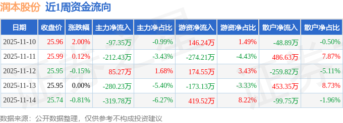 资金流向数据方面,本周润本股份主力资金合计净流出824.51万元,游资资金合计净流入292.98万元,散户资金合计净流入531.53万元。本周资金流向一览见下表: