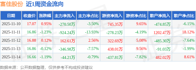 资金流向数据方面,本周富佳股份主力资金合计净流出1423.31万元,游资资金合计净流入790.01万元,散户资金合计净流入633.3万元。本周资金流向一览见下表: