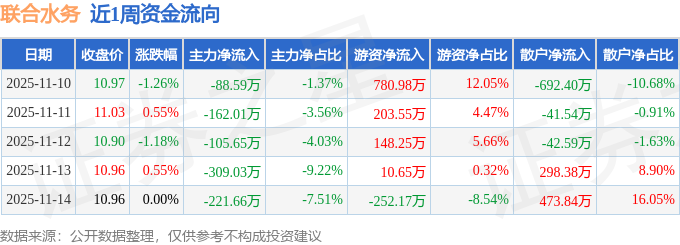 资金流向数据方面,本周联合水务主力资金合计净流出886.94万元,游资资金合计净流入891.25万元,散户资金合计净流出4.31万元。本周资金流向一览见下表: