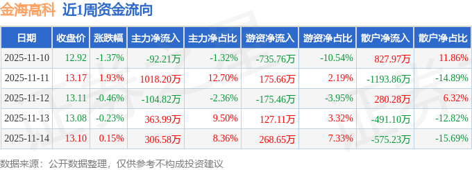 资金流向数据方面,本周金海高科主力资金合计净流入1491.75万元,游资资金合计净流出339.8万元,散户资金合计净流出1151.94万元。本周资金流向一览见下表: