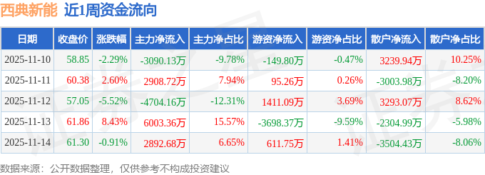 资金流向数据方面,本周西典新能主力资金合计净流入4010.47万元,游资资金合计净流出1730.08万元,散户资金合计净流出2280.39万元。本周资金流向一览见下表: