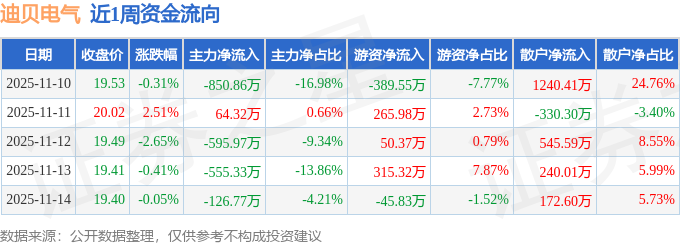 资金流向数据方面,本周迪贝电气主力资金合计净流出2064.6万元,游资资金合计净流入196.3万元,散户资金合计净流入1868.3万元。本周资金流向一览见下表: