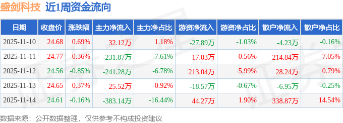 资金流向数据方面,本周盛剑科技主力资金合计净流出798.65万元,游资资金合计净流入227.87万元,散户资金合计净流入570.78万元。本周资金流向一览见下表: