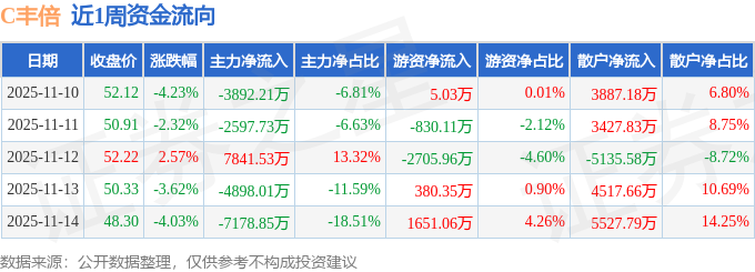 资金流向数据方面,本周丰倍生物主力资金合计净流出1.07亿元,游资资金合计净流出1499.62万元,散户资金合计净流入1.22亿元。本周资金流向一览见下表: