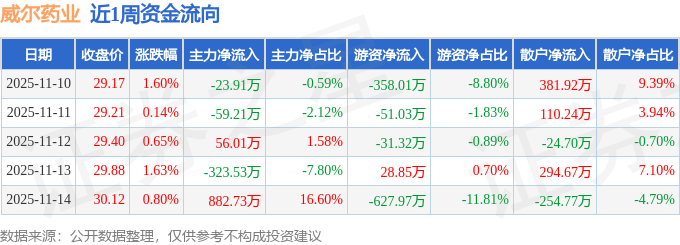 资金流向数据方面,本周威尔药业主力资金合计净流入532.11万元,游资资金合计净流出1039.48万元,散户资金合计净流入507.37万元。本周资金流向一览见下表: