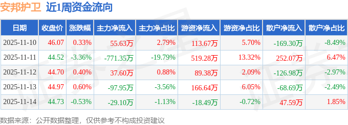 资金流向数据方面,本周安邦护卫主力资金合计净流出805.17万元,游资资金合计净流入870.48万元,散户资金合计净流出65.31万元。本周资金流向一览见下表: