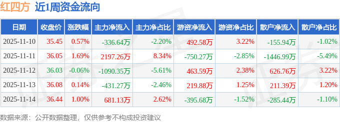 资金流向数据方面,本周红四方主力资金合计净流入1020.13万元,游资资金合计净流入30.1万元,散户资金合计净流出1050.23万元。本周资金流向一览见下表: